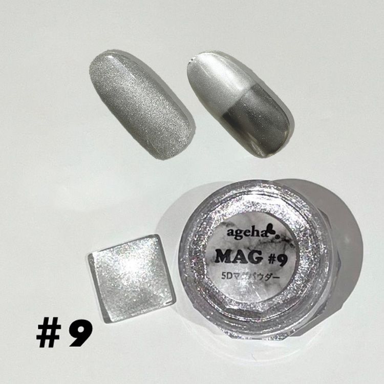 ※カラージェル(シアー・クリア系)とMAGパウダー#9を2:1で混ぜ合わせ、お好みでクリアジェル(agehaグラデーションクリアジェル等)で調整してご使用いただくことでMAGパウダー#1-8とは違った表現をすることができます。