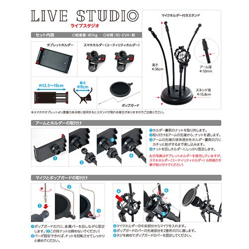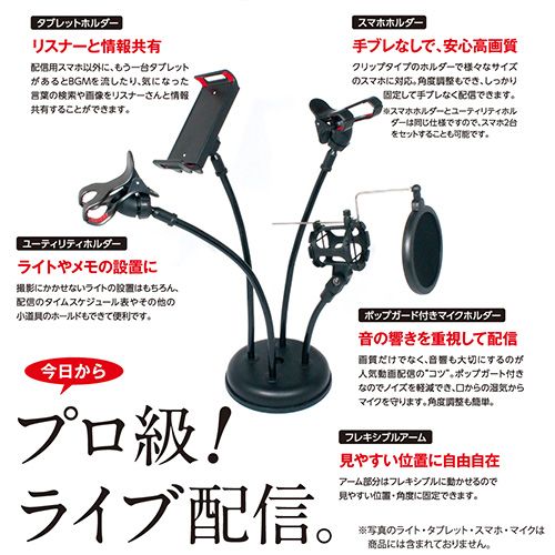 タブレットホルダー、スマホホルダー、ユーティリティーホルダー、カップガード付きマイクホルダーはフレキシブルアームで1台で配信充実