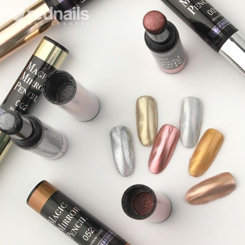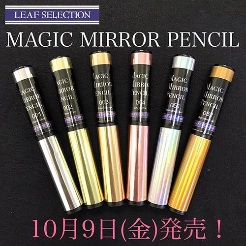 LEAF SELECTIONの第一弾商品、マジックミラーペンシルは粒子が細かく、上品で美しい表面に。スティックタイプな為、パウダーの飛散がなく簡単、スピーディーにミラーネイルを仕上げる事が出来ます。ベースに塗るカラーや光の反射で見える色が変わり、色々な表情が楽しめます。