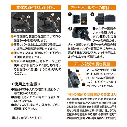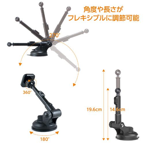 密着ジェル付き超強力吸盤でしっかり固定。角度や高さ・長さがフレキシブルに調節可能。