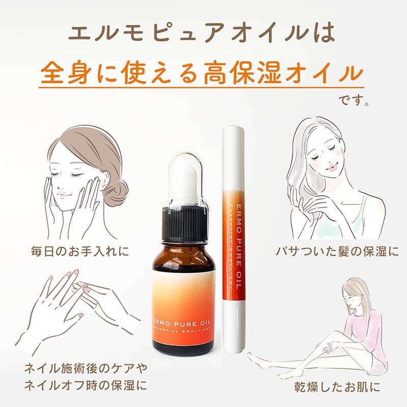 石油を原料とする鉱物油は一切使わず、100%植物油を使用していますので、お顔にも安心してお使いいただけます。 お肌が乾燥気味の方は、今お使いの乳液やクリームにエルモピュアオイルを2~3滴加えてお使いください。