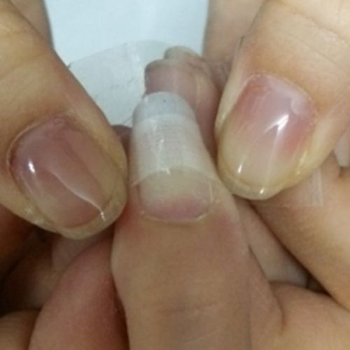 割れたネイルのヒビや割れた部分の大きさに沿って、ドットシルクラップを切り取り、ネイルの割れた部分に貼りつけ、その上から、ジェルネイルをするだけで完成!