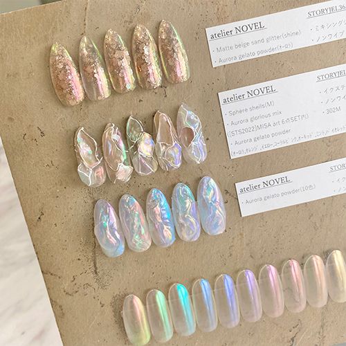 スフェールシェルズやオーロラグロリアスミックスとの相性がとてもよく、合わせてご使用いただくことで輝きが美しく、それぞれの良さが引き立つアートに仕上がります。