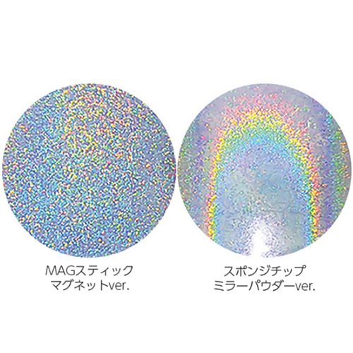 クリアジェルやカラージェルにMAGパウダーを混ぜて塗布し、硬化前に専用のMAGスティック(別売り)を近づけると幻想的な模様やラインが作れます。