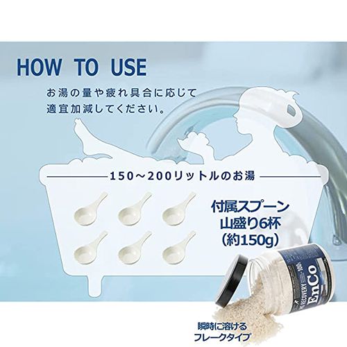 150~200リットルのお湯に対し、スプーン山盛り6杯(約150g)を湯船に入れて、20分を目安にご入浴ください。疲れが気になる部分は入浴中にマッサージしてご使用ください。