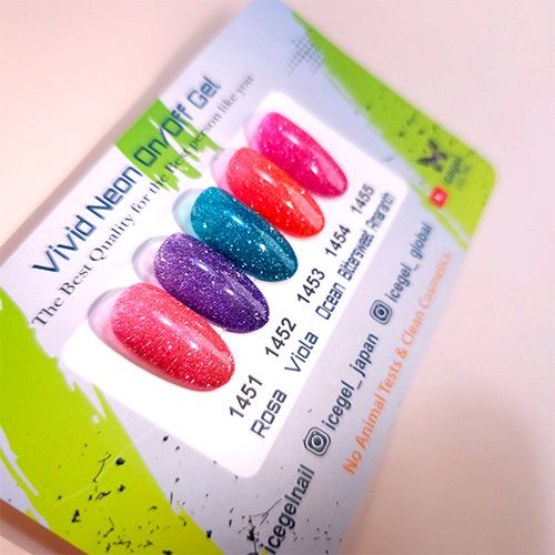フラッシュジェルのシリーズ「オンオフジェル」にビビットなネオンカラーが登場。鮮やかでありながらフラッシュラメでシックなシリーズです。