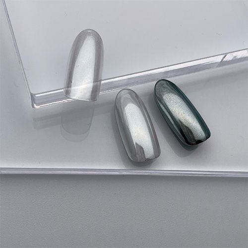 シルバーよりも白っぽくとてもキレイです。ベージュ系のネイルと相性がいいと思います。
