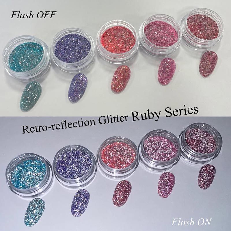 光りを当てる事で、より一層のキラキラ感を楽しむ事ができます。こちらはそれぞれのカラーに赤を加えたルビーシリーズ。