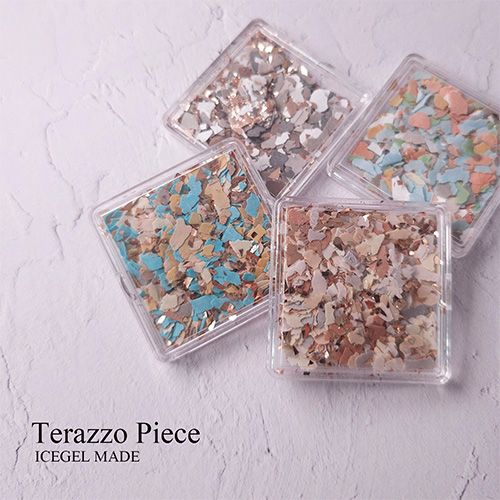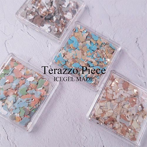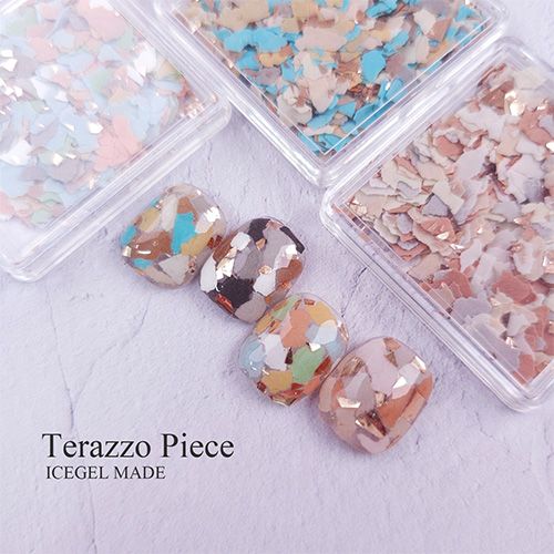 薄いカラーピースと金箔ピースを組み合わせて高級感のあるテラゾータイル模様ができます。スティッキージェルで装着すると簡単にアートができおすすめです。