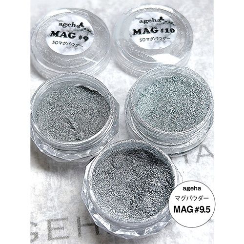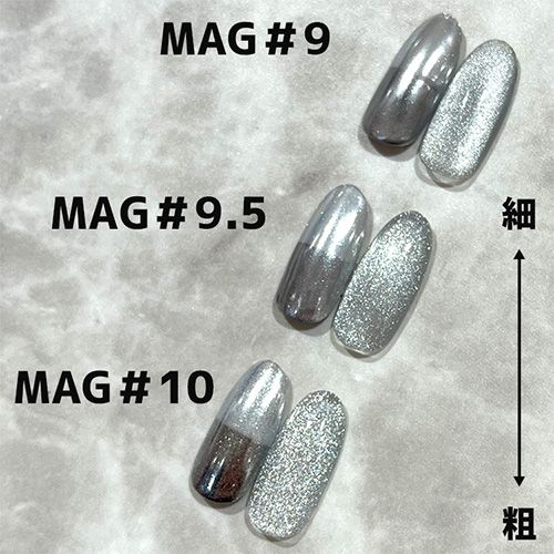 粒子の細かいMAGパウダー#9と粒子の粗めのMAGパウダー#10の間の粒子で砂鉄感が少ないシルバーなパウダーです。