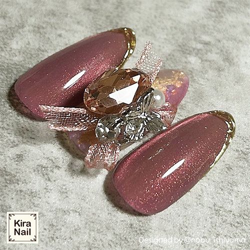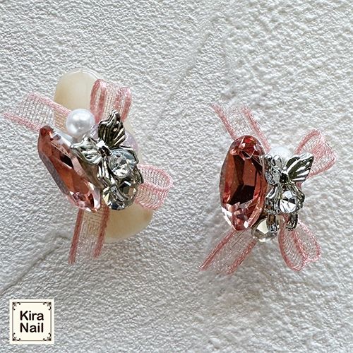大きいストーンとリボンを中心にクリアストーン、パール、バタフライパーツがバランス置かれた3Dパーツパーツです。