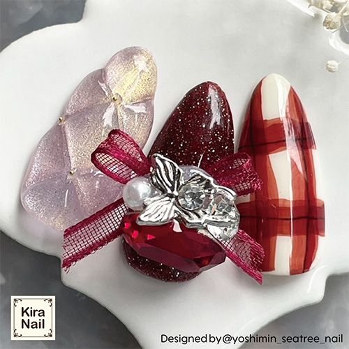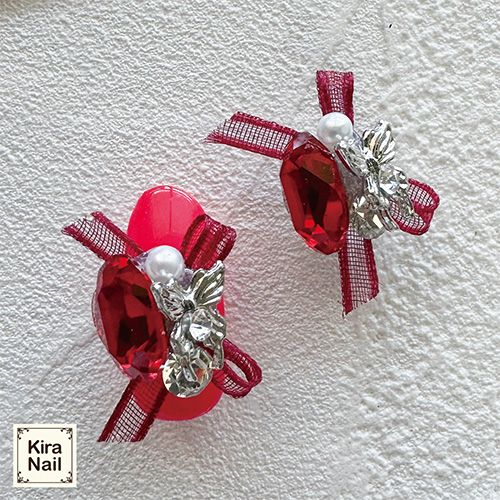 大きいストーンとリボンを中心にクリアストーン、パール、バタフライパーツがバランス置かれた3Dパーツパーツです。