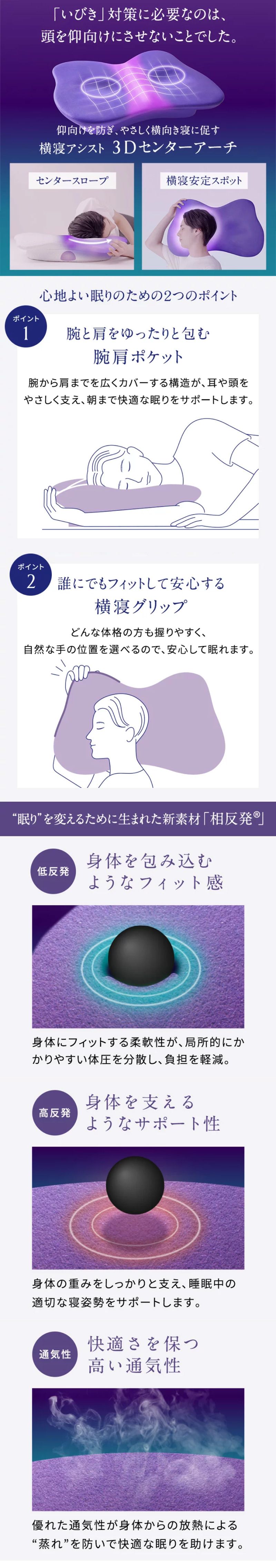 やさしく横向き寝に促す、いびき対策まくらです。