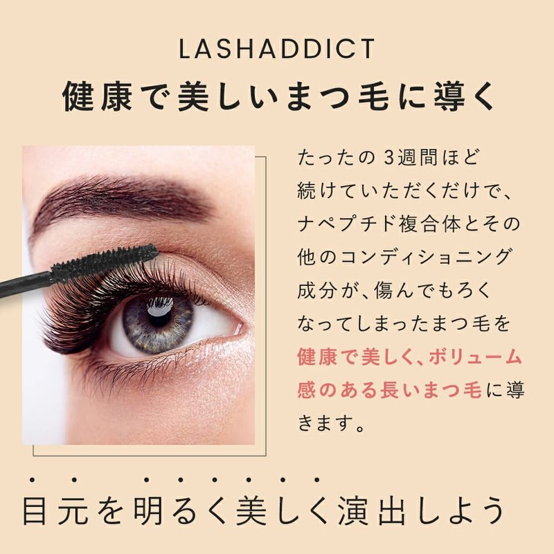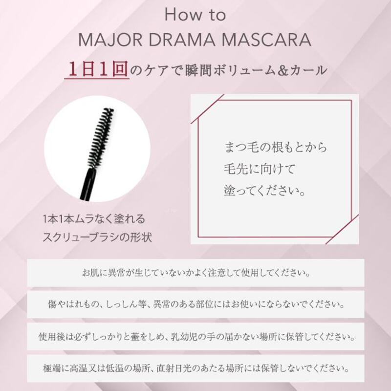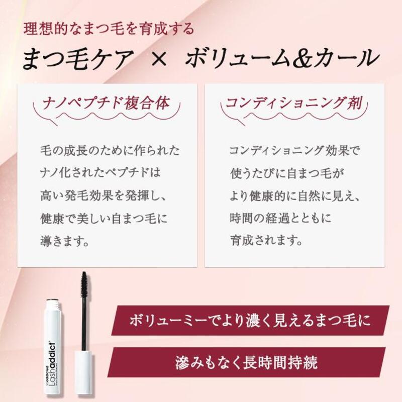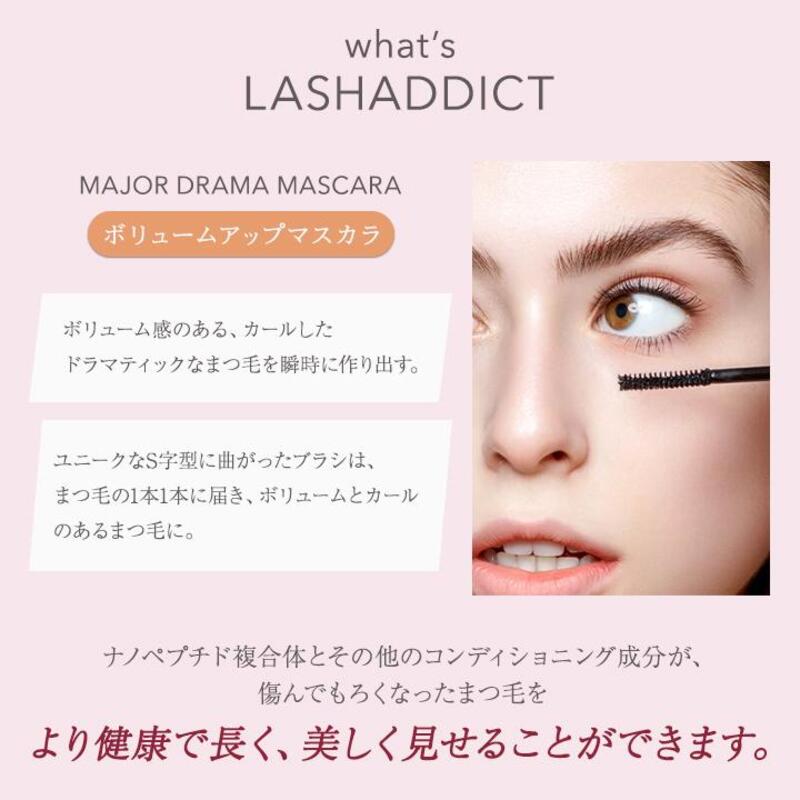 Lashaddict Major Drama Mascara(ラッシュアディクト メジャー ドラマ マスカラ)は、ボリューム感のある、カールしたドラマティックなまつ毛を瞬時に作り出します。ナノペプチド複合体とその他のコンディショニング成分が、傷んでもろくなったまつ毛をより健康で長く、美しく見せることができます