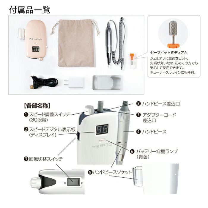 付属品:専用電源アダプター(必ず専用アダプターをご使用ください。)、充電ケーブル、ハンドピーススタンド、収納ポーチ、ビット1本付き(セーフビットミディアム)