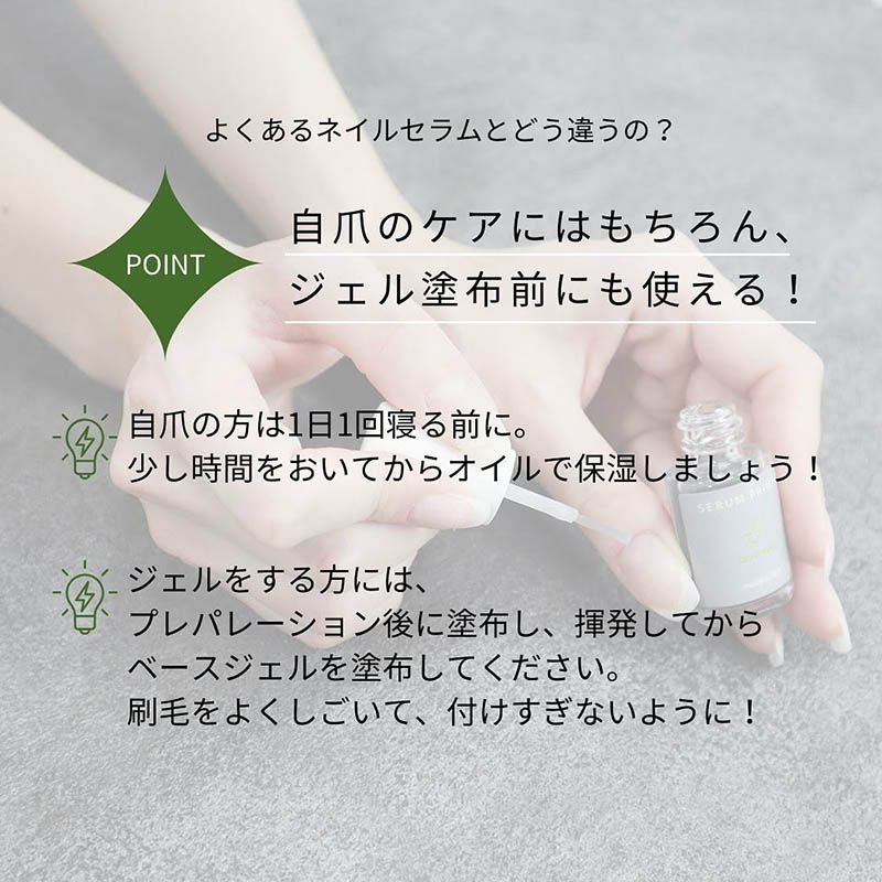 ケアとして、爪の裏やジェルが伸びてきたところに塗布してお使いください。