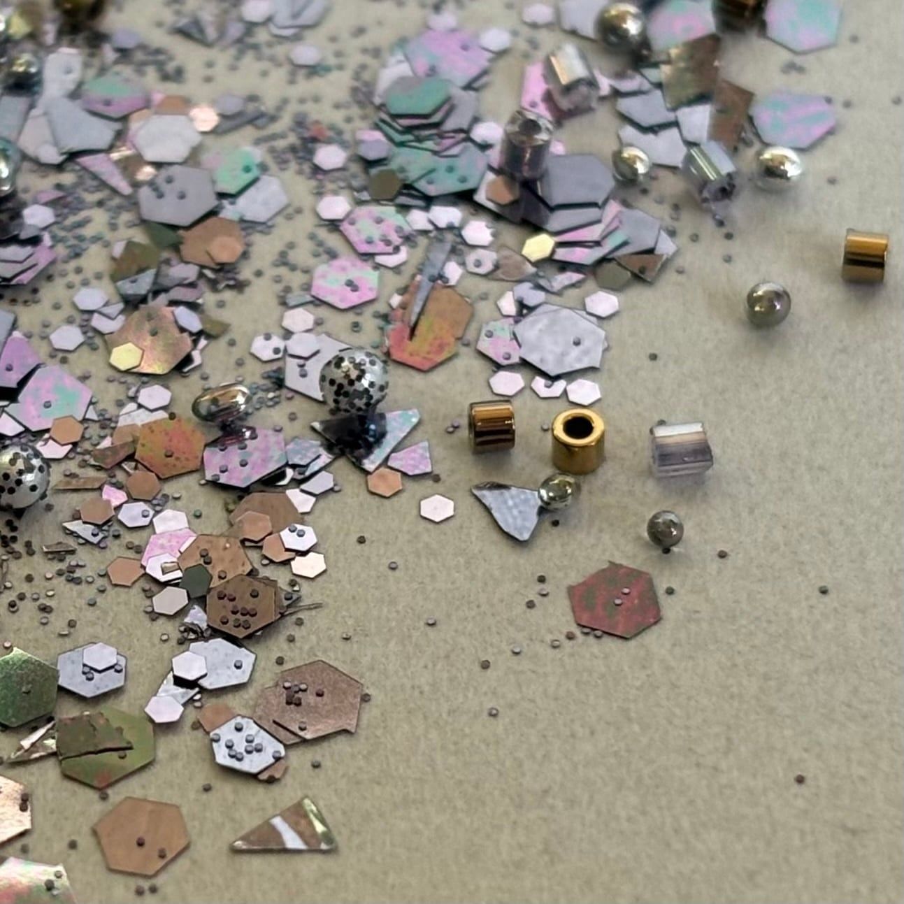 「グレー」は、六角ブルーグレーホロ・乱切りブルーグレーホロ・クリアブルーグレービーズ・ゴールドビーズ・球体パール・球体メタルボール・グリッターetcが入っています。