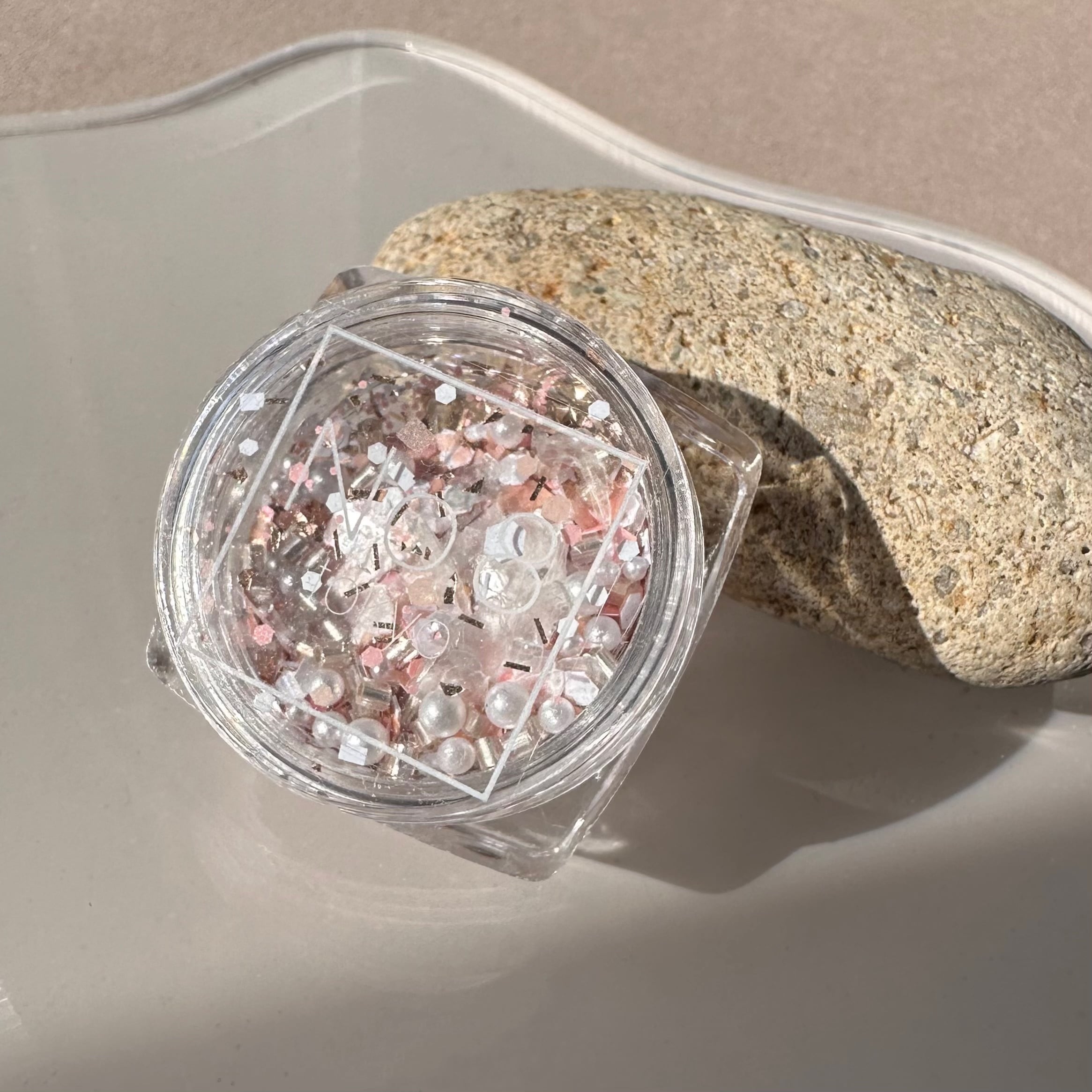 ビーズ・六角ホロ・球体パール・マイカ・ラメなどのサイズや色味が少しづつ違うものが入っています。
