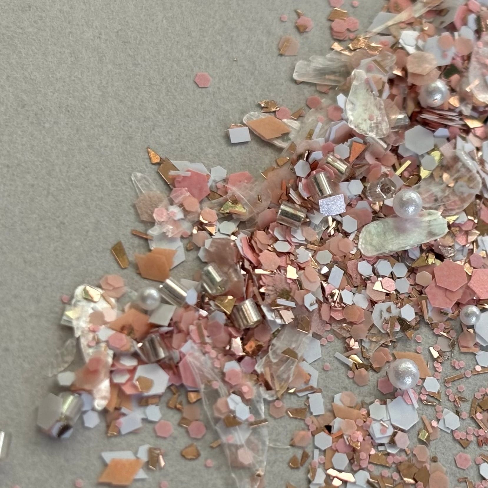 「ピンク」は、六角白ホロ・ピンクホロ・乱切りカットゴールドホロ・線状ゴールドホロ・ホワイトマイカ・球体パール・クリアシャンパンカラーのビーズetcが入っています。
