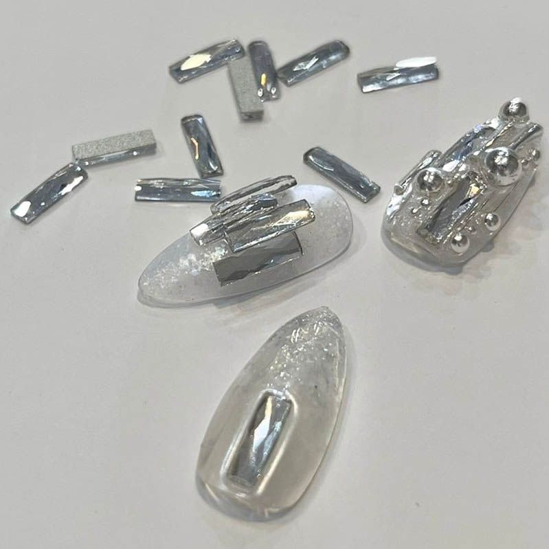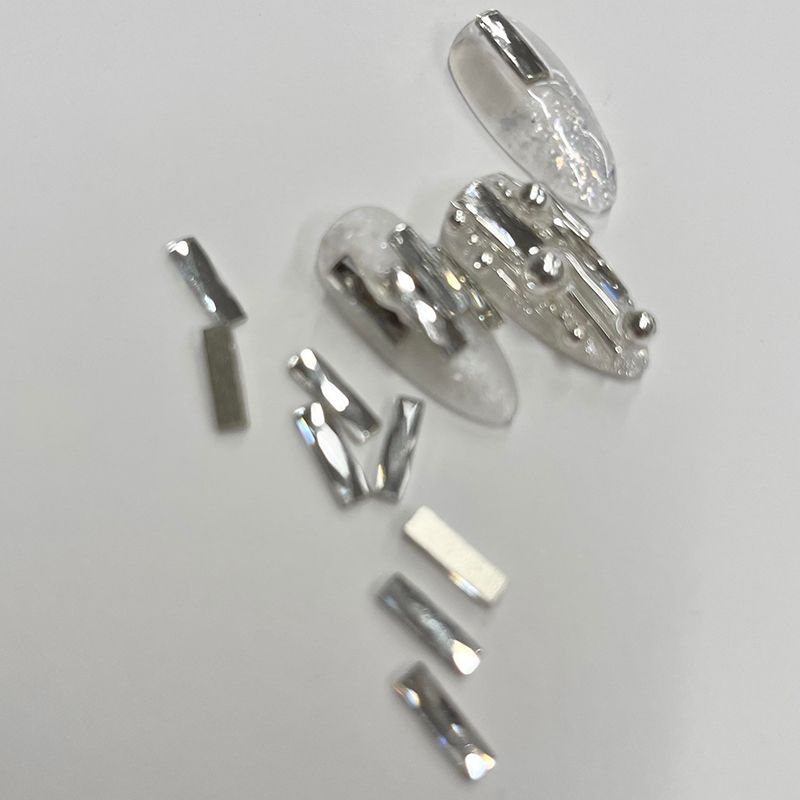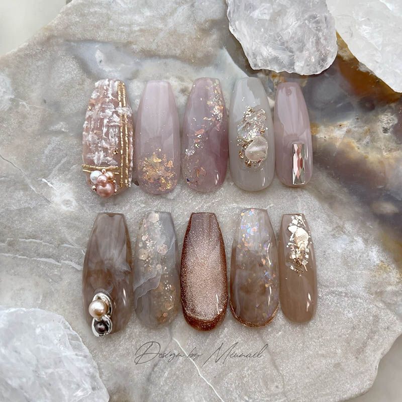 クリスタルスクエアとパールを使って、ベースをベージュにするととても上品なデザインになりました。おすすめです。