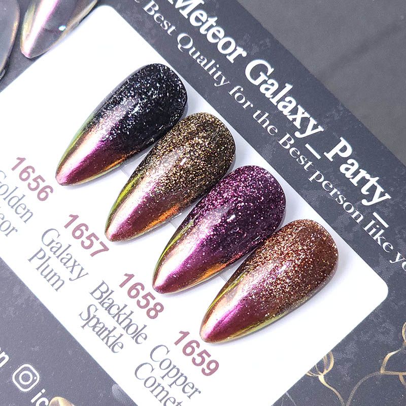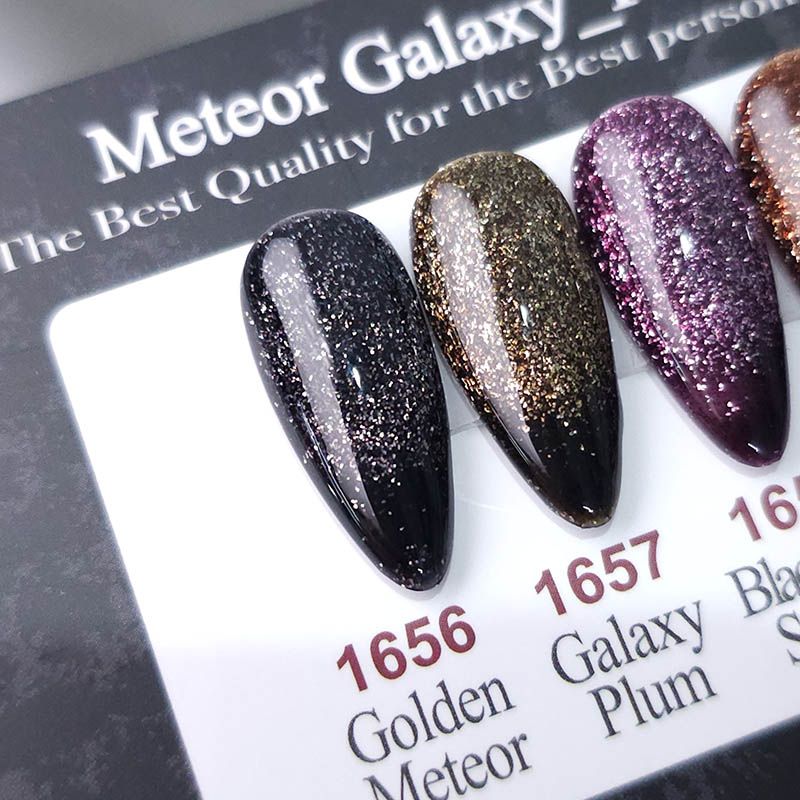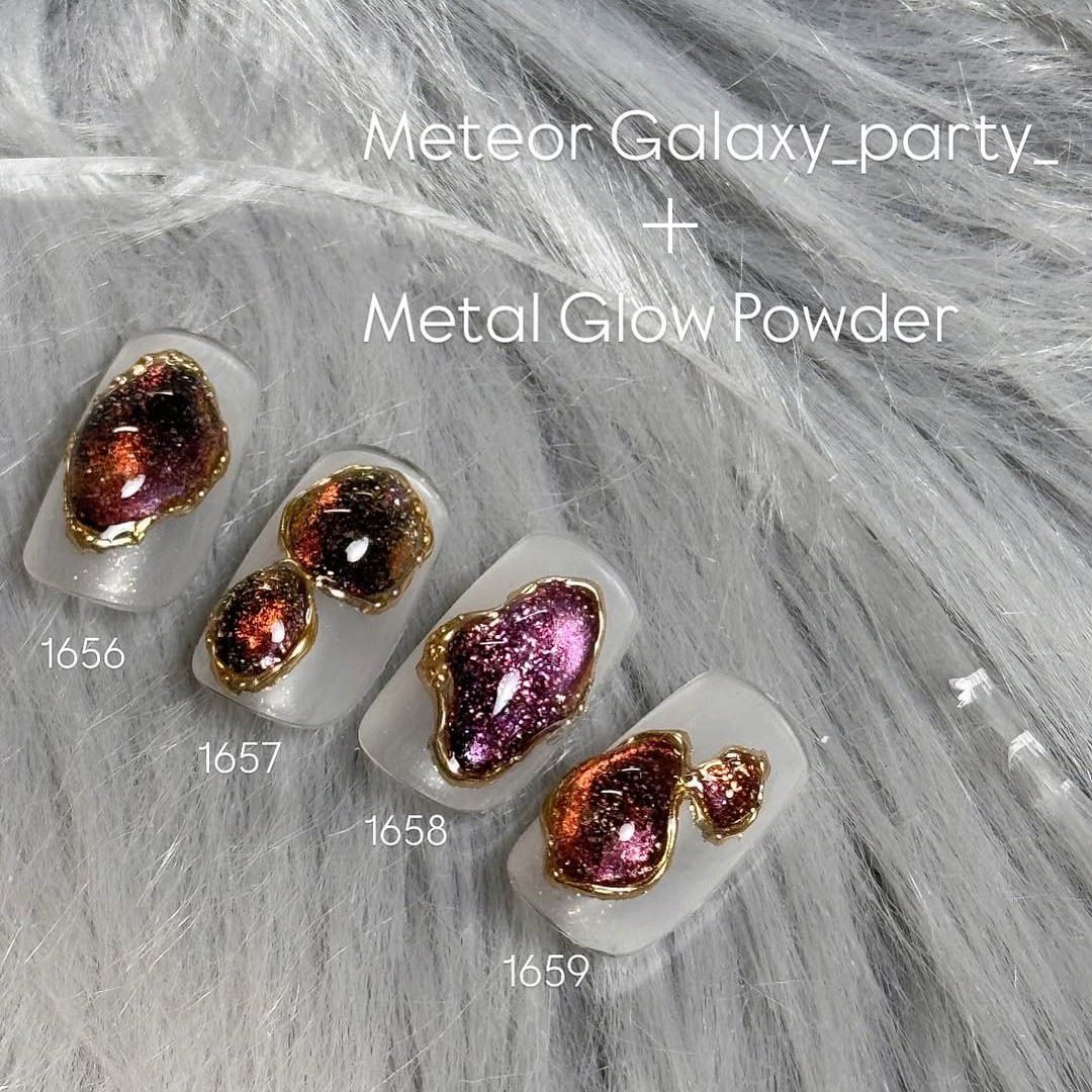 大粒グリッターとマグネットパウダーで流星で輝く夜空のようなネイルを演出します。