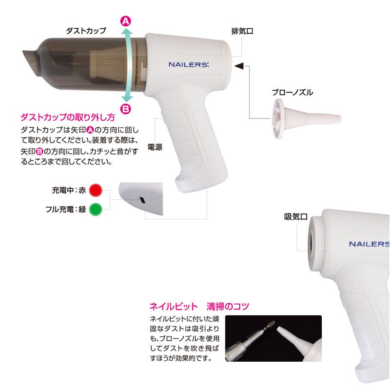 施術後にいち早くネイルダストの吸引、吹き飛ばしができるハンディクリーナー