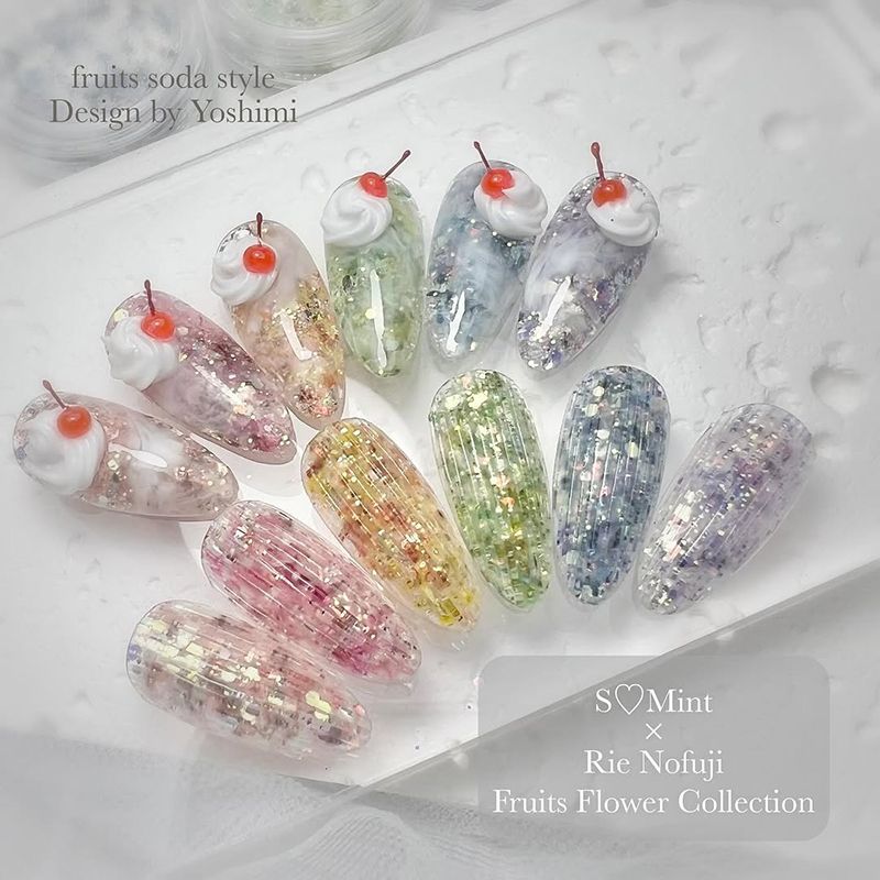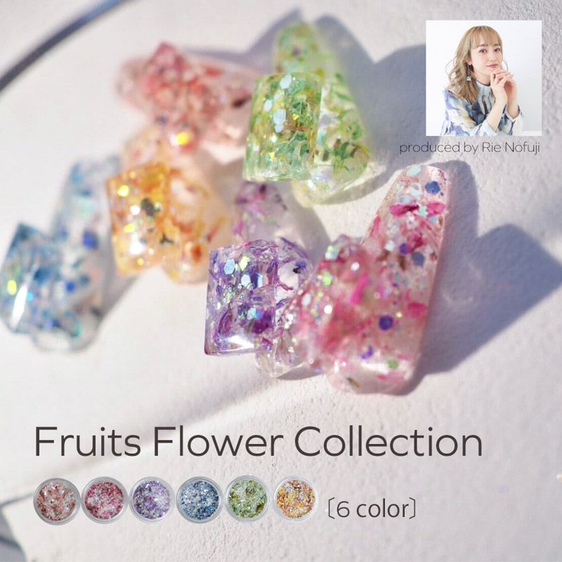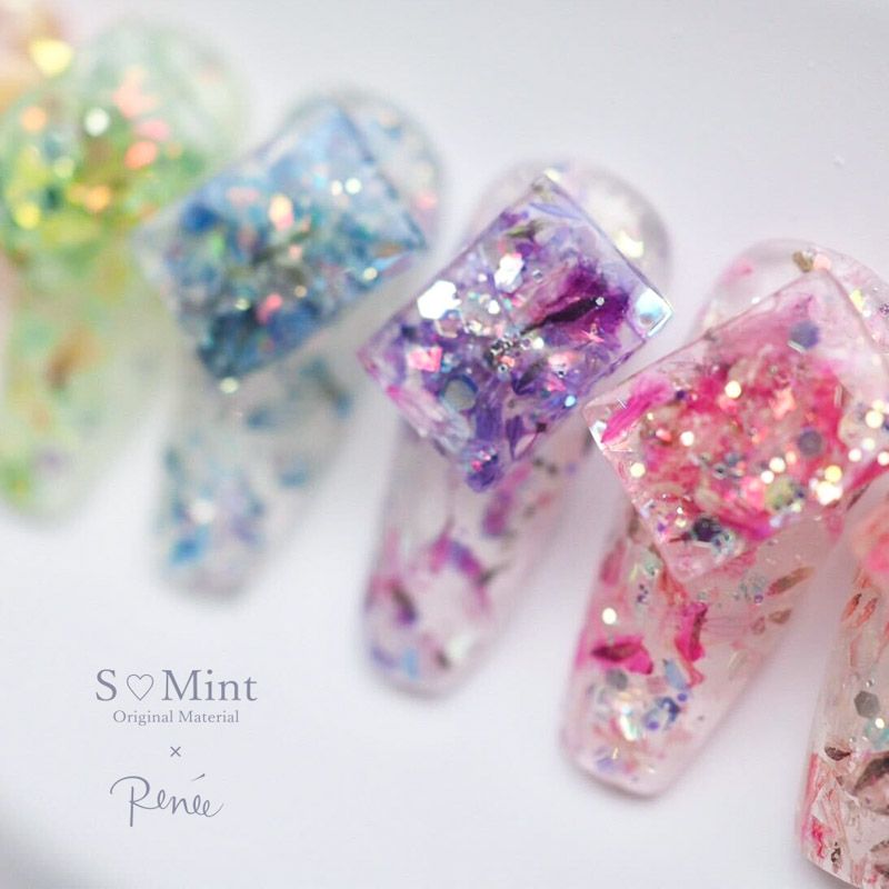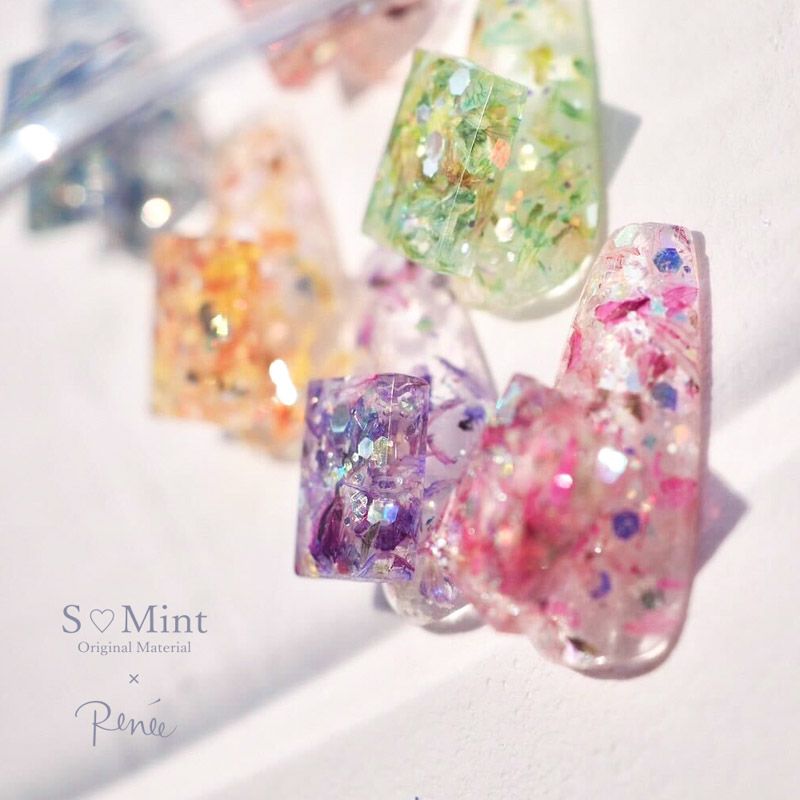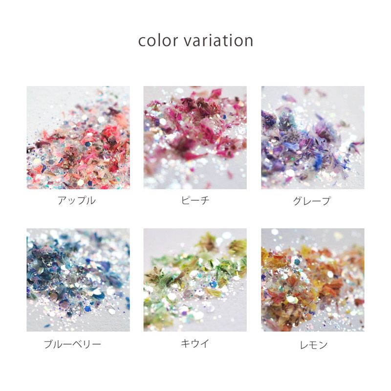 キラキラと輝く大きさが異なるクリアグリッターに鮮やかなカラーのフラワーが混ざっていてラメだけでは出せない彩りの豊かさとジューシー感を演出してくれます