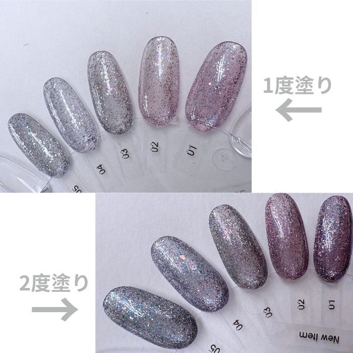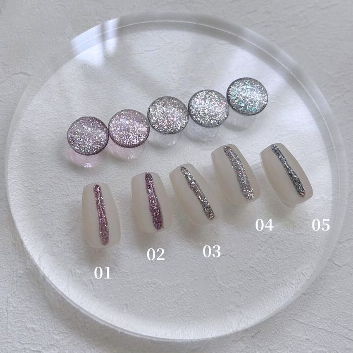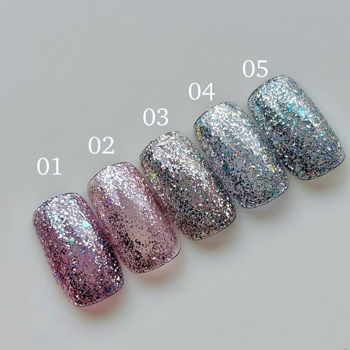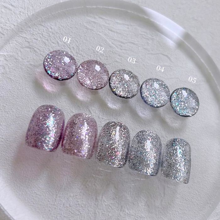 フレーク・ホログラム・ラメなど、複数の素材が絶妙にミックスされており、単色でも重ね塗りでもお楽しみいただけます。