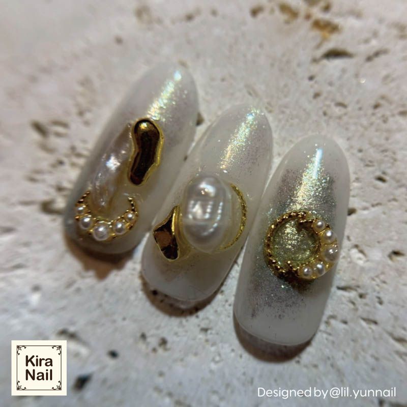 月のシェープのゴールドの土台にパールストーンがのっているかわいさUPのムーンパーツです。