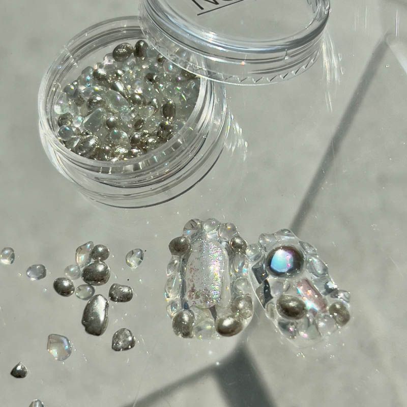 1.5~4mmくらいのサイズの不規則な形のオーロラとシルバーのガラスストーンがミックスされたアイテムです。