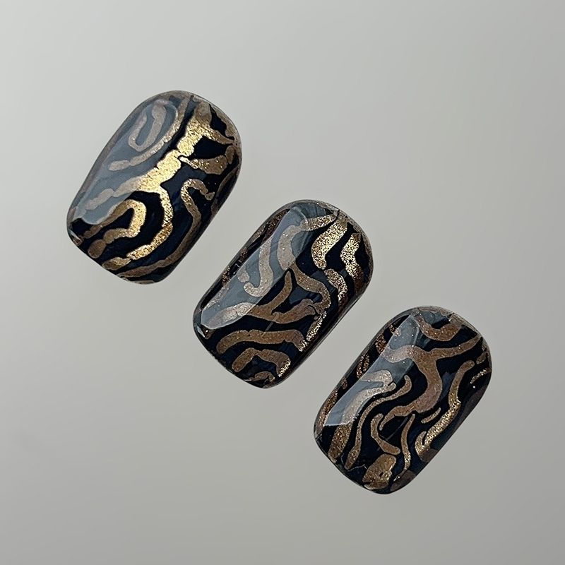 専用のレースパンチングベースジェルを塗布&硬化後、レースパンチングカラージェルを一塗りし、ドット棒を使い文字や絵柄をくり抜きます。